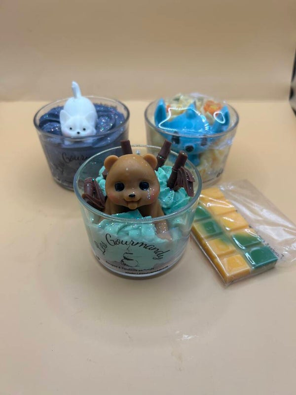 3 bougies gourmande, monoi, pure freesia et linge propre.