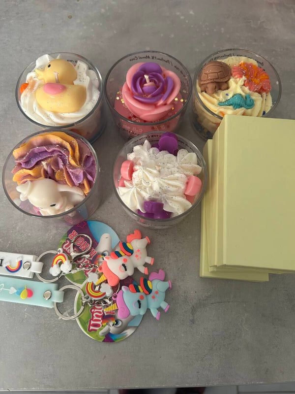 Une bougie canard mon doudou, une bougie fleur parfum monoi coco, une tortu parfum flore floras, une flambant parfum vanille des îles et une bougie zizou parfum cerise noir, 3 suspension fleur de coton et une la petite robe noir ☺️