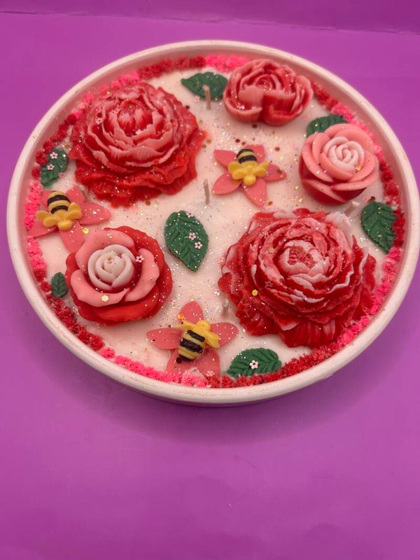 Centre de table bougie parfum rose, 330 gr de cire de soja et fragrance de grasse.