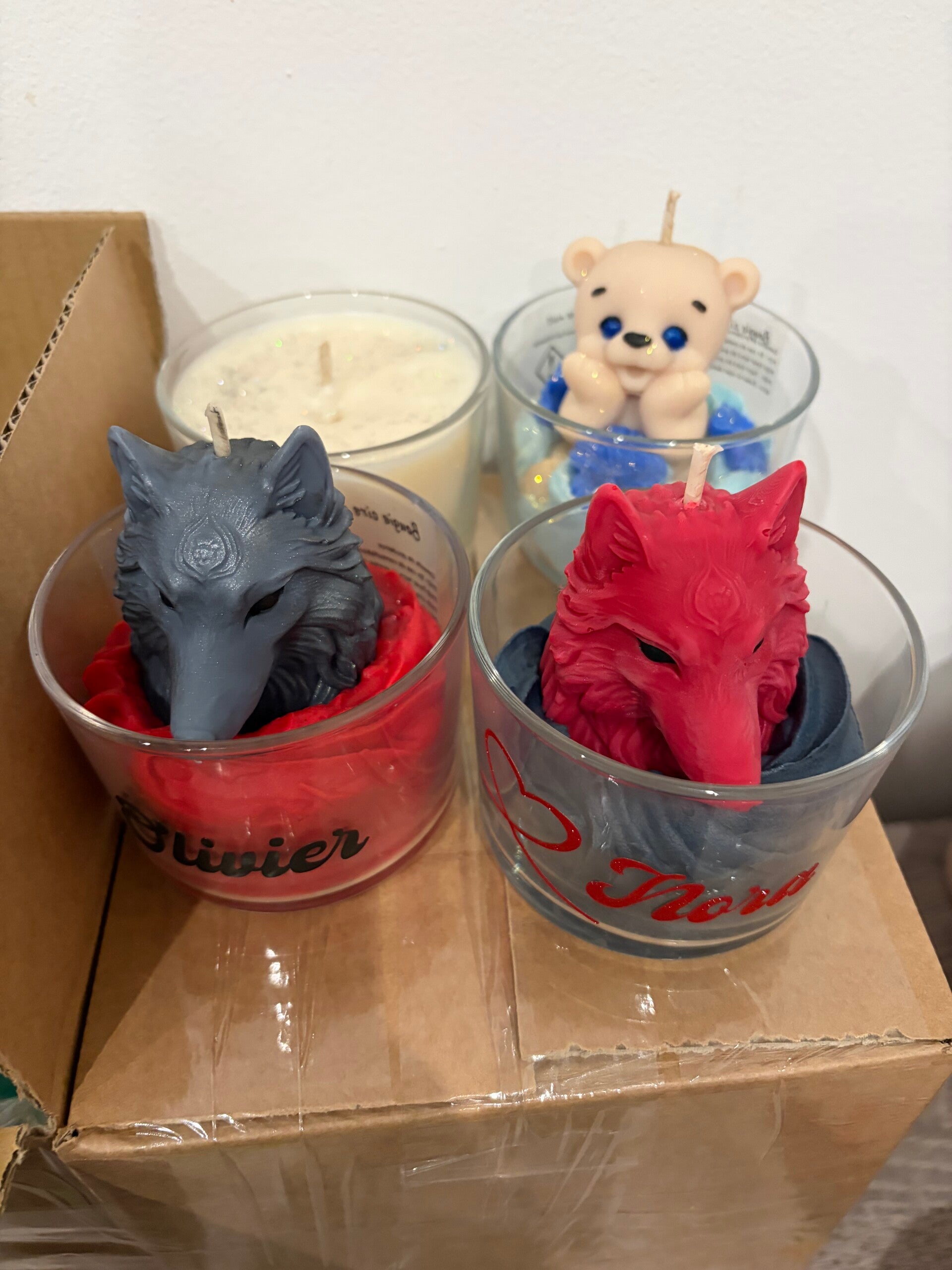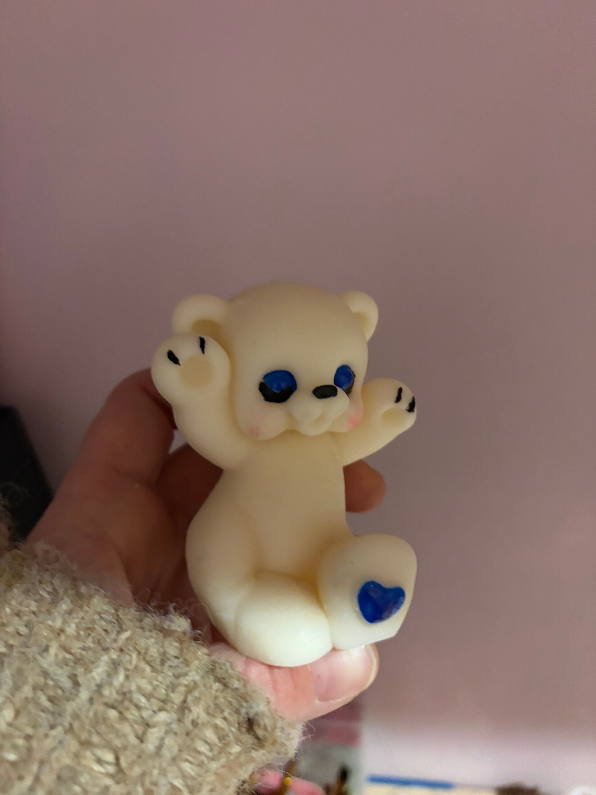 4 bougies gourmande 2 avec étiquettes et 3 ours parfum adoucissant.