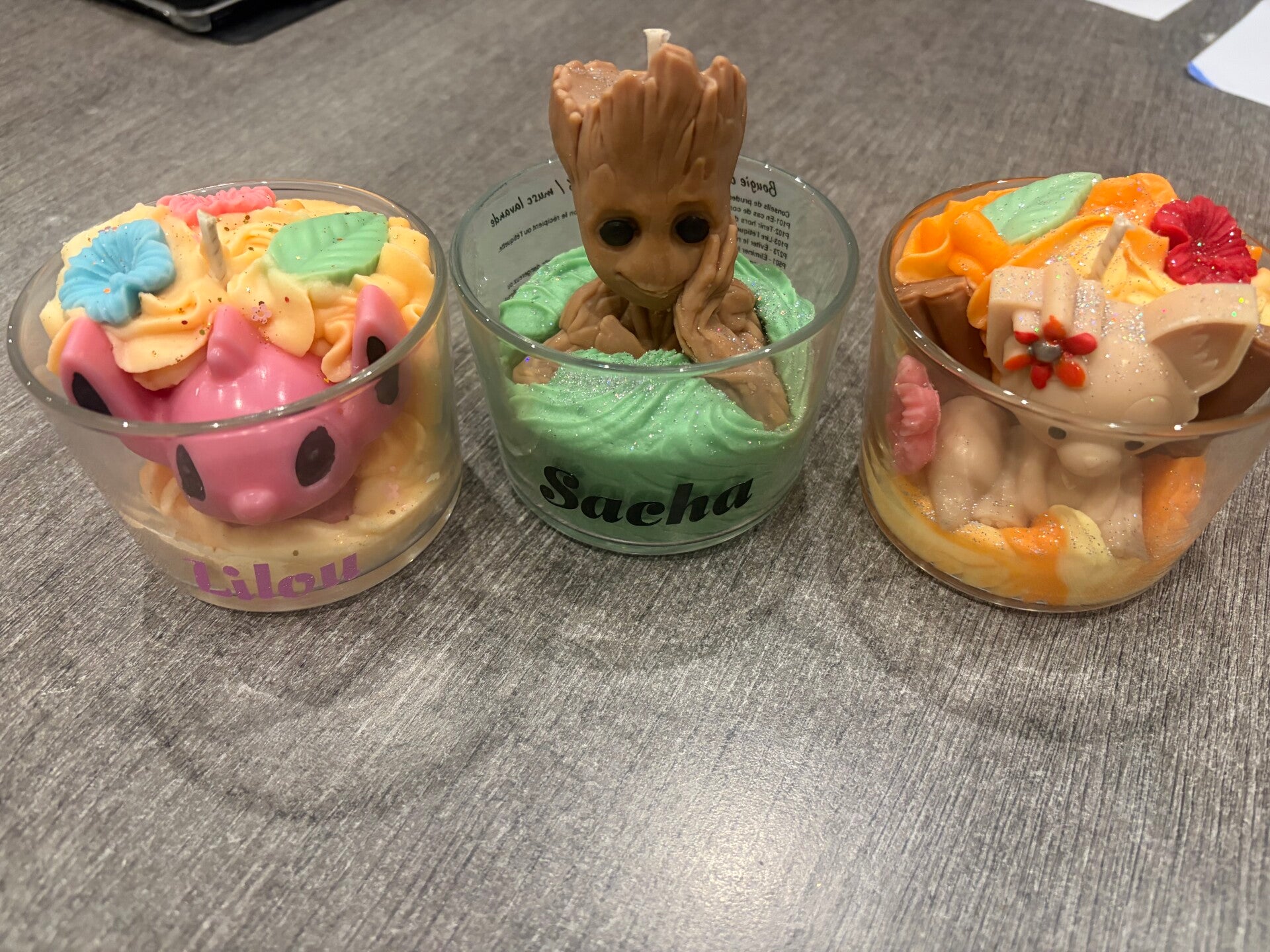 3 bougies gourmandes, 2 étiquettes.